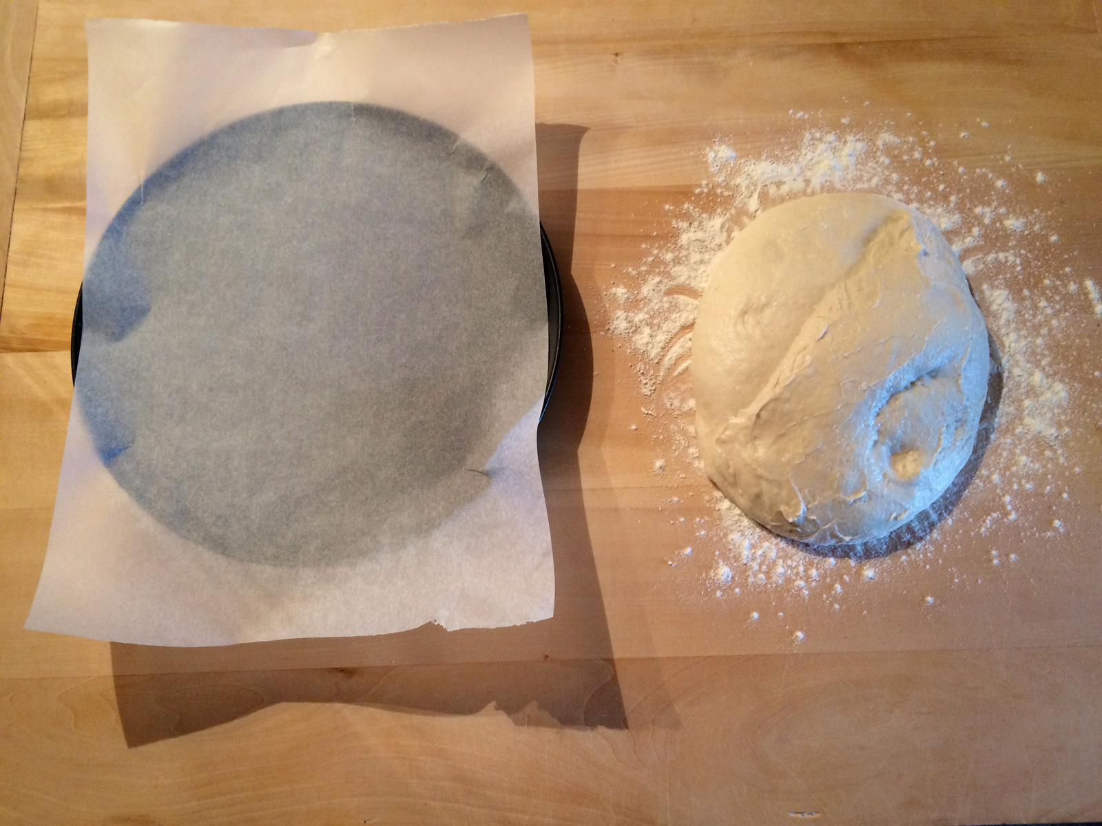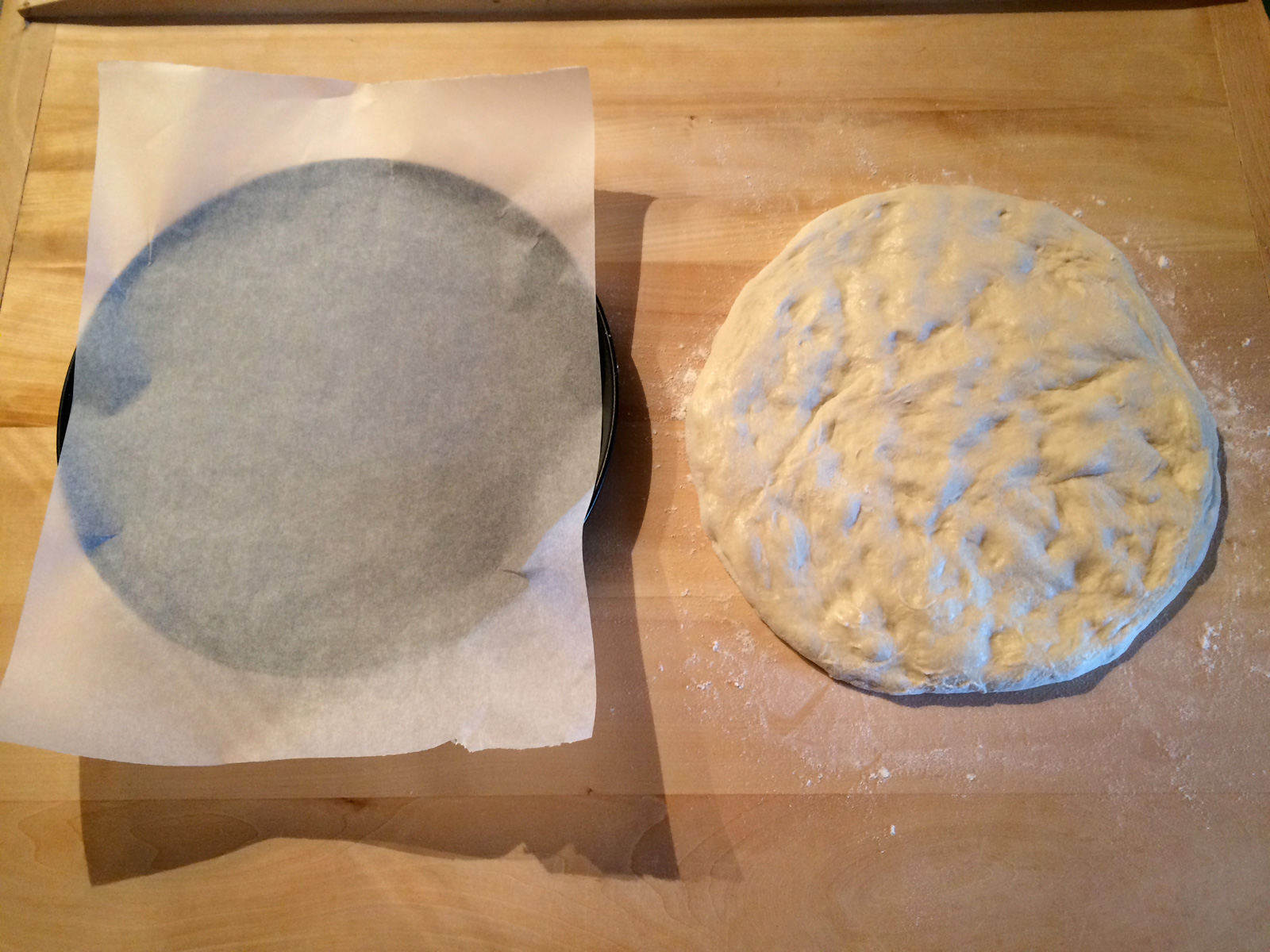 Passata un’ora, trasferite l’impasto sul piano e allargatelo con le mani infarinate partendo dal centro, trasferitelo poi su di una teglia da forno (io ne usata una da 30 cm) che avete rivestito di carta forno.