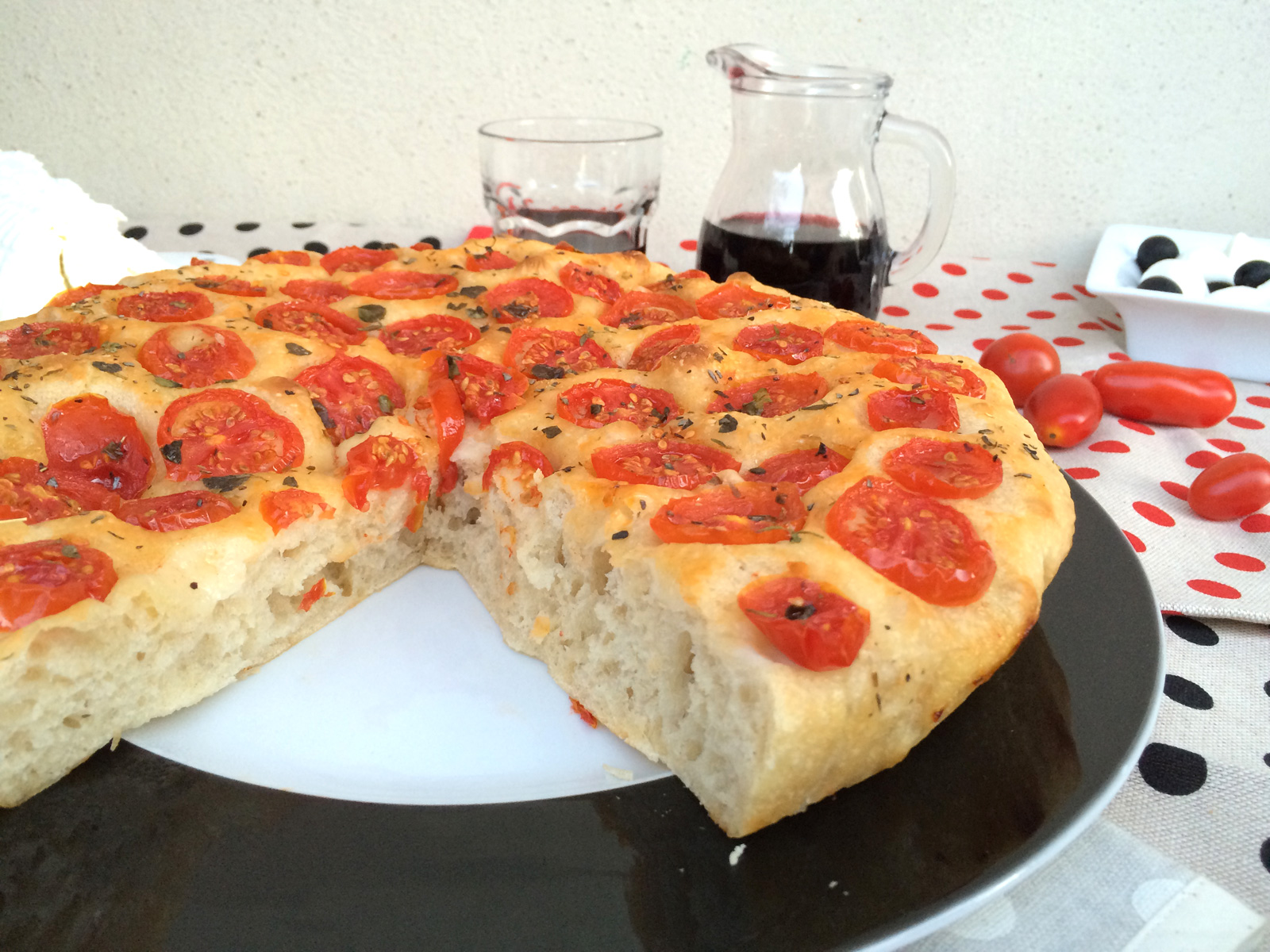 I lievitati sono una delle mie gradi passioni, è inutile tentare di negarlo. Mi piace proprio scegliere le farini, impastare, vedere il pane o la focaccia che lievitano, sentire il rumore della crosta appena tolto dal forno e tante altre cose che chi fa il pane in casa conosce benissimo. Da qualche anno ormai ho smesso di usare il lievito di birra, ho la mia pasta madre che accudisco e che in questi anni mi ha dato tante soddisfazioni. Ho fatto pani, schiacciate, panini, pizze, bagel, cornetti davvero di tutto e ogni volta mi viene sempre qualche idea nuova. Per esempio, l’altro giorno mi hanno portato una cassetta di pomodori, avete presente quelli piccoli e dolci, che verrebbe voglia di mangiarli come se fossero ciliegie? Quindi ho pensato perchè non fare una focaccia morbida morbida e con dei pomodorini e un po’ di erbe aromatiche sopra? Una focaccia che che profumasse di estate. E così è andata. Adesso vi racconto come l’ho preparata!