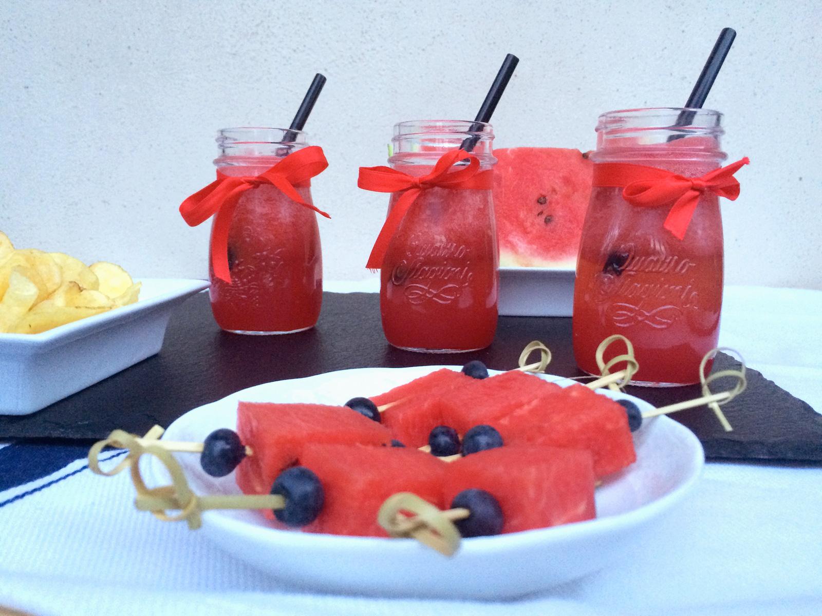 Nel frattempo preparate degli spiedini con dei mirtilli e l’anguria a cubetti.