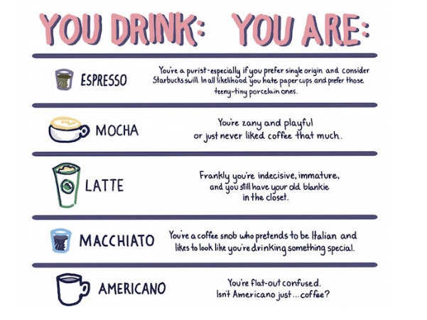Ogni scelta che facciamo dice qualcosa di noi. Ormai veniamo classificati in base a come ci vestiamo, a che luoghi frequentiamo, potevamo non essere classificati per quello che mangiamo o beviamo? Così se al bancone di un bar decidiamo di prendere un cappuccino piuttosto che un caffè americano o un caffè ristretto, il barista che è dinnazi a noi ci ha già inquadrato.