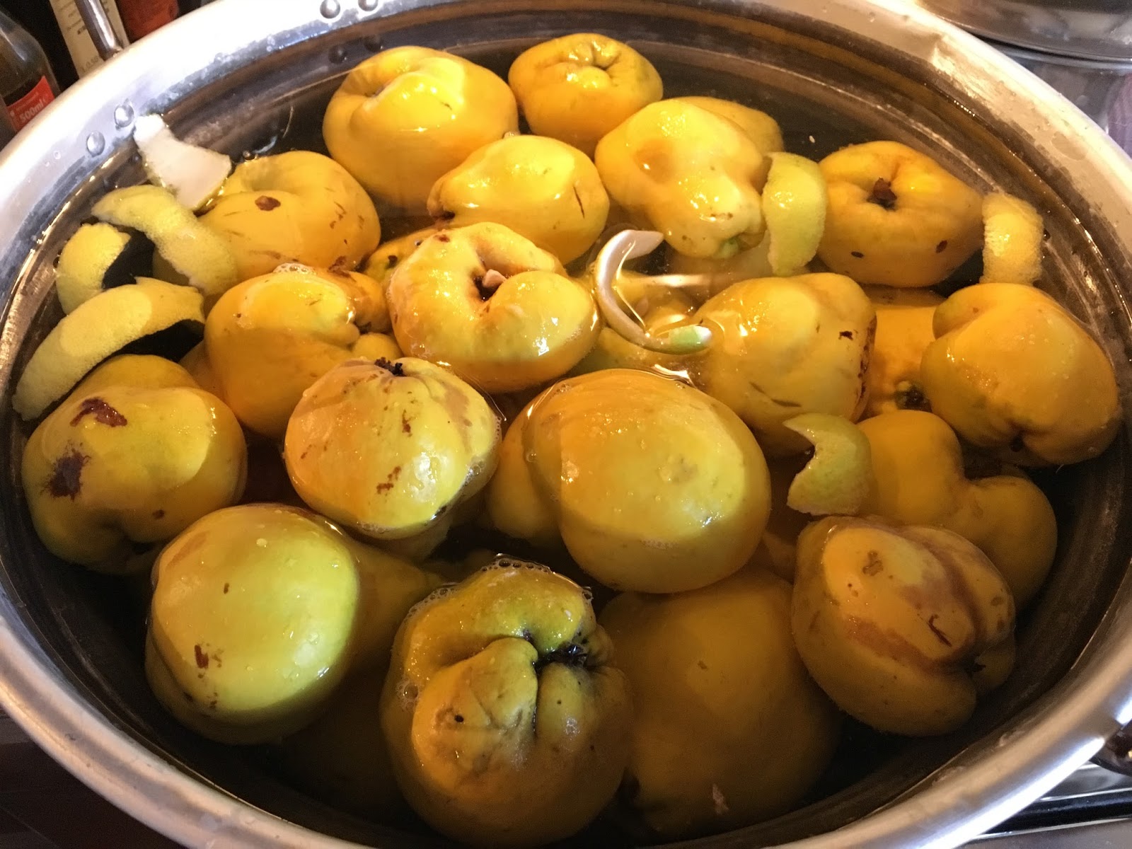 Per prima costa strofinate le mele cotogne con un panno umido per far loro perdere la peluria che le ricopre, poi in un’ampia pentola di acqua bollente, scottatele per 20/25 minuti con alcuni pezzi di buccia di limone, in modo che non si anneriscano. Dopo questa prima cottura, me le cotogne dovrebbero essere abbastanza morbide, da poter essere sbucciate. A questo punto quindi fatele raffreddare per qualche minuto, sbucciatele, tagliatele a pezzi ed eliminate il torsolo che sarà ancora molto legnoso. Passate i pezzi di mela cotogna al passaverdura e mettete la polpa in una pentola dal fondo spesso.