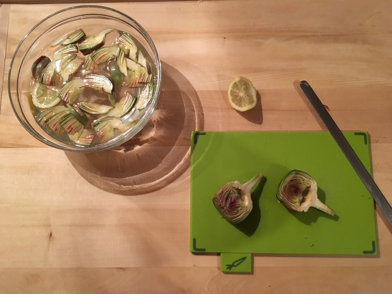 Pulite i carciofi, eliminando le foglie più esterne, tagliate la punta del carciofo e poi tagliatelo a metà. A questo punto con un coltello affilato tagliate il cuore di carciofo in sezione in modo da ottenere tante fette sottili, dopo aver eliminato l’eventuale peluria interna. Immergete immediatamente i carciofi nella ciotola prima che si ossidino.