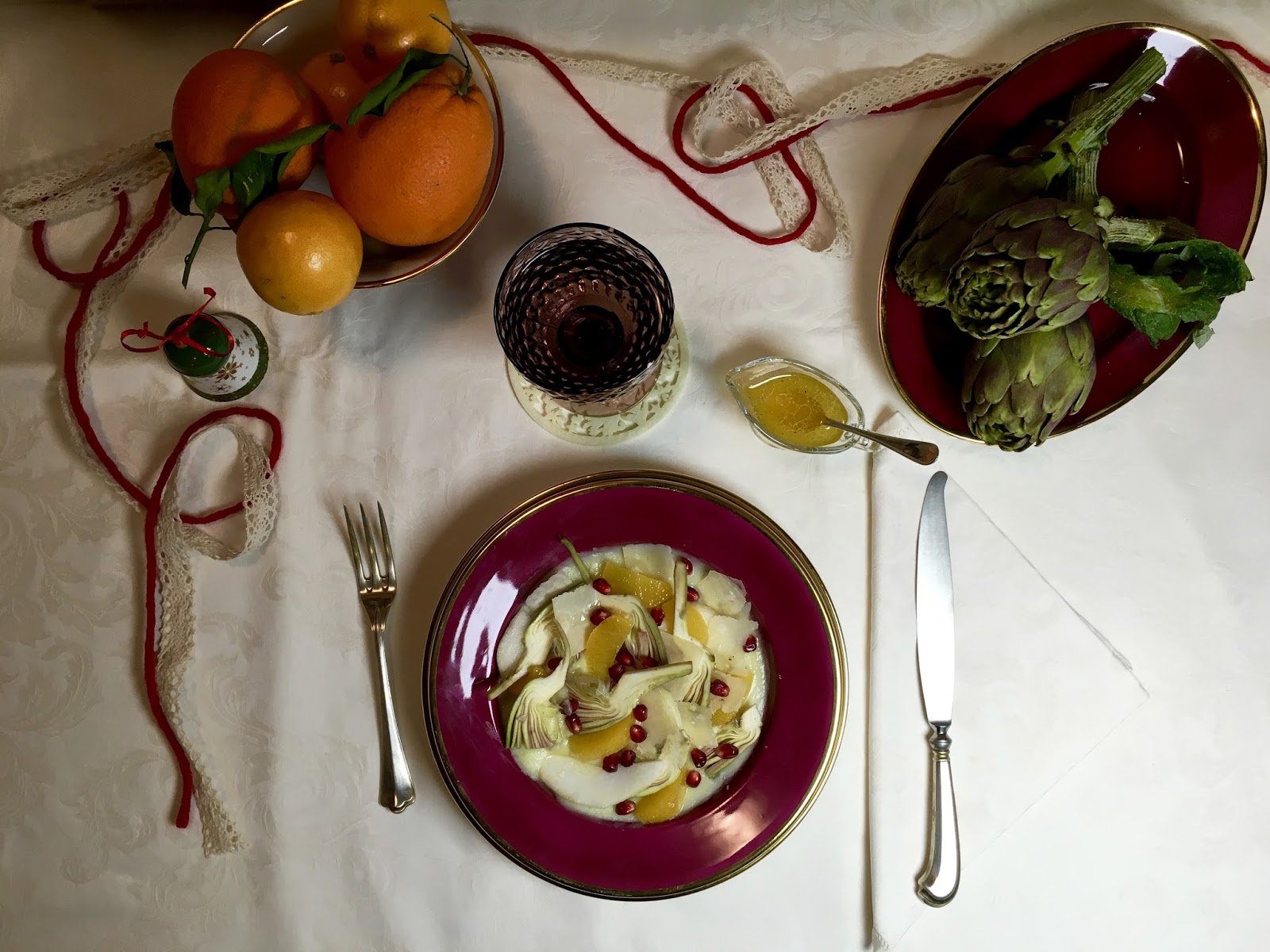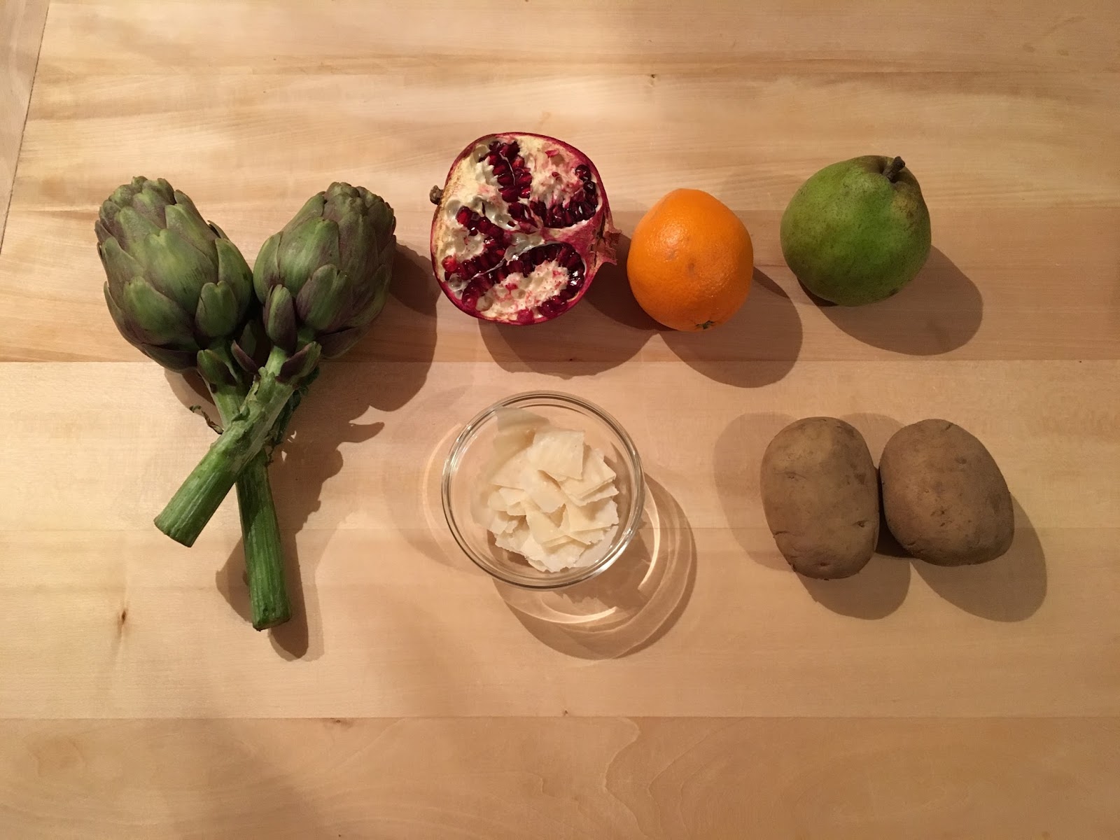 Al momento di impiattare, versate la purea di patate nel piatto in modo da ottenere un fondo di base, su cui posizionerete gli spicchi di arancia, la pera ed i carciofi (dopo averli asciugati con della carta assorbente). Aggiungete anche il Parmigiano Reggiano e infine i chicchi di melagrana. Condite utilizzando la vinaigrette e.. buon appetito!