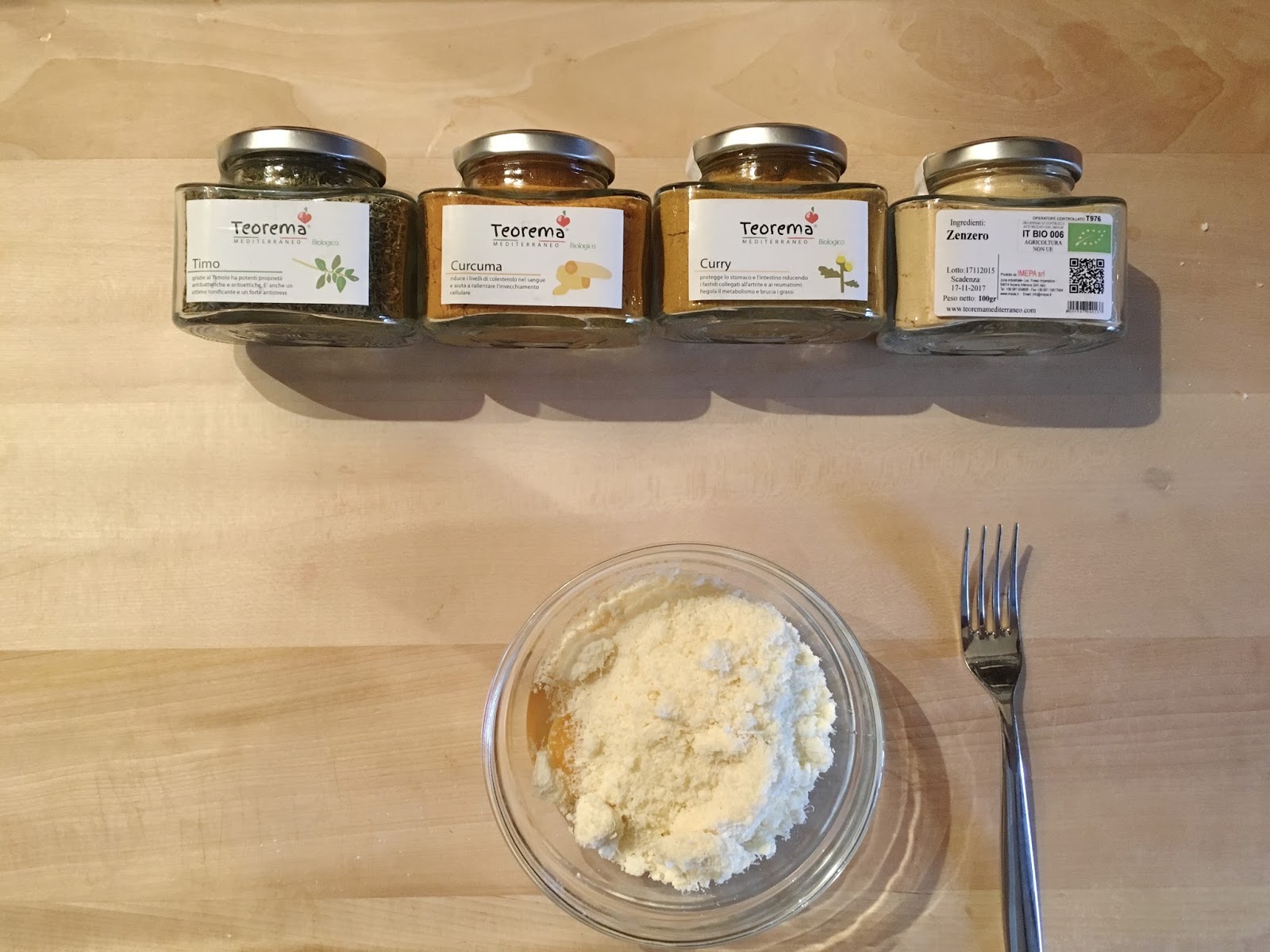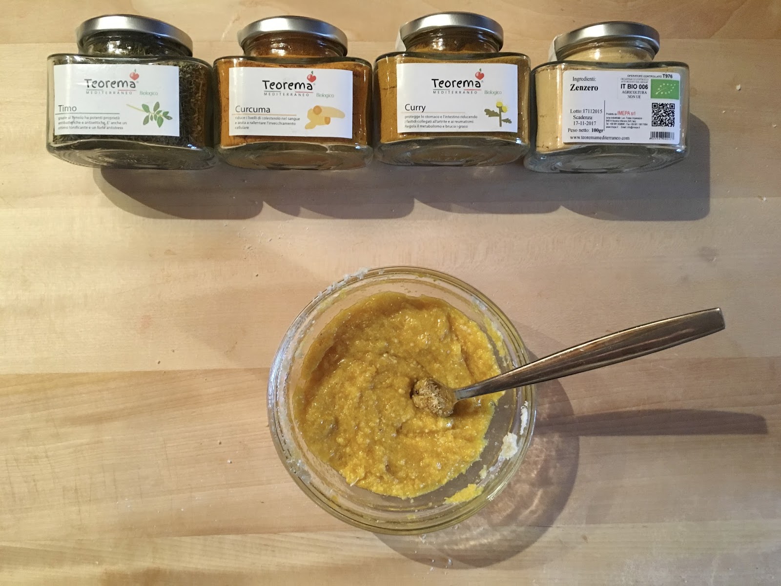 Nel box che ho ricevuto da Teorema ho trovato diverse spezie: un vasetto di Curcuma, uno di Curry, uno di Zenzero e uno di Timo. Con queste ho pensato di realizzare dei biscotti salati che sono perfetti per un aperitivo tra amici: un bicchiere di vino (per restare in tema dieta mediterranea) quattro chiacchiere e siamo tutti più contenti.