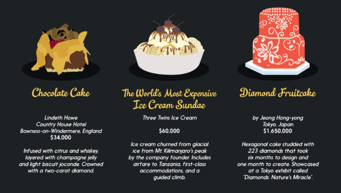 Ogni tanto sui giornali esce la notizia di qualche bar che ha praticato prezzi pazzeschi, così un caffè a San Marco a Venezia costa 20 euro o un bicchiere di cognac sul lungo Senna costa una fucilata. Per non parlare di alcune follie a New York o a Londra.. insomma paese che vai prezzo pazzo che trovi. Ma in questa top ten di follie quali sono i cibi che costano davvero più di tutti? Ecco un’infografica che ci aiuta a districarci in questa jungla di prezzi per milionari. Quali sono i 25 cibi più cari del mondo? C’è per esempio la Pizza Royale, ispirata a James Bond che costa 4200 dollari, oppure il bagel di Westin che a New York costa 1000 dollari tondi tondi. Se volete spendere meno potete puntare sull’hot dog al Serendipity per 69 dollari oppure per la carne di vacca Kobe che in Giappone costa solo 150 dollari per libbra.