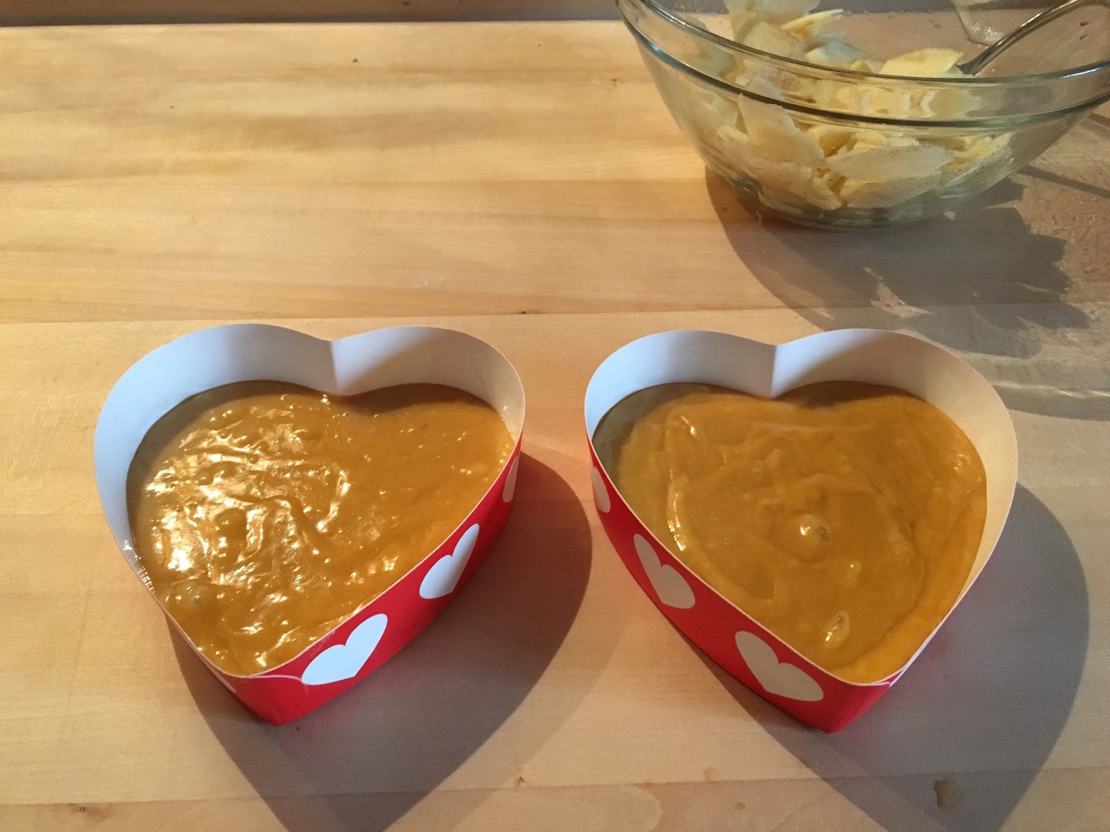 Versate l’impasto nelle 2 tortiere di cartone a forma di cuore (3 euro da Tiger) e poi aggiungete le fettine di mela, inserendole verticalmente nell’impasto.