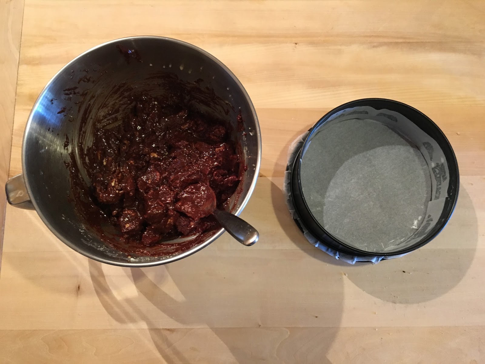 Per prima cosa spezzettate i biscotti con le mani in modo molto grossolano e lasciateli da parte. Poi cominciamo con l’impasto, fate a pezzetti il burro, lasciatelo ammorbidire e poi montatelo con lo zucchero e il sale. Io ho usato la planetaria con la frusta, ma potete farlo anche a mano o con uno sbattitore elettrico. Mettete un pentolino al fuoco e sciogliete a fiamma molto bassa (meglio se a bagno maria) il cioccolato con la panna. Mescolate spesso per fare amalgamare bene e poi lasciate intiepidire. Nel frattempo preparate la tortiera: utilizzate una tortiera a cerniera e rivestite il fondo e le pareti con un disco e delle strisce di carta da forno.