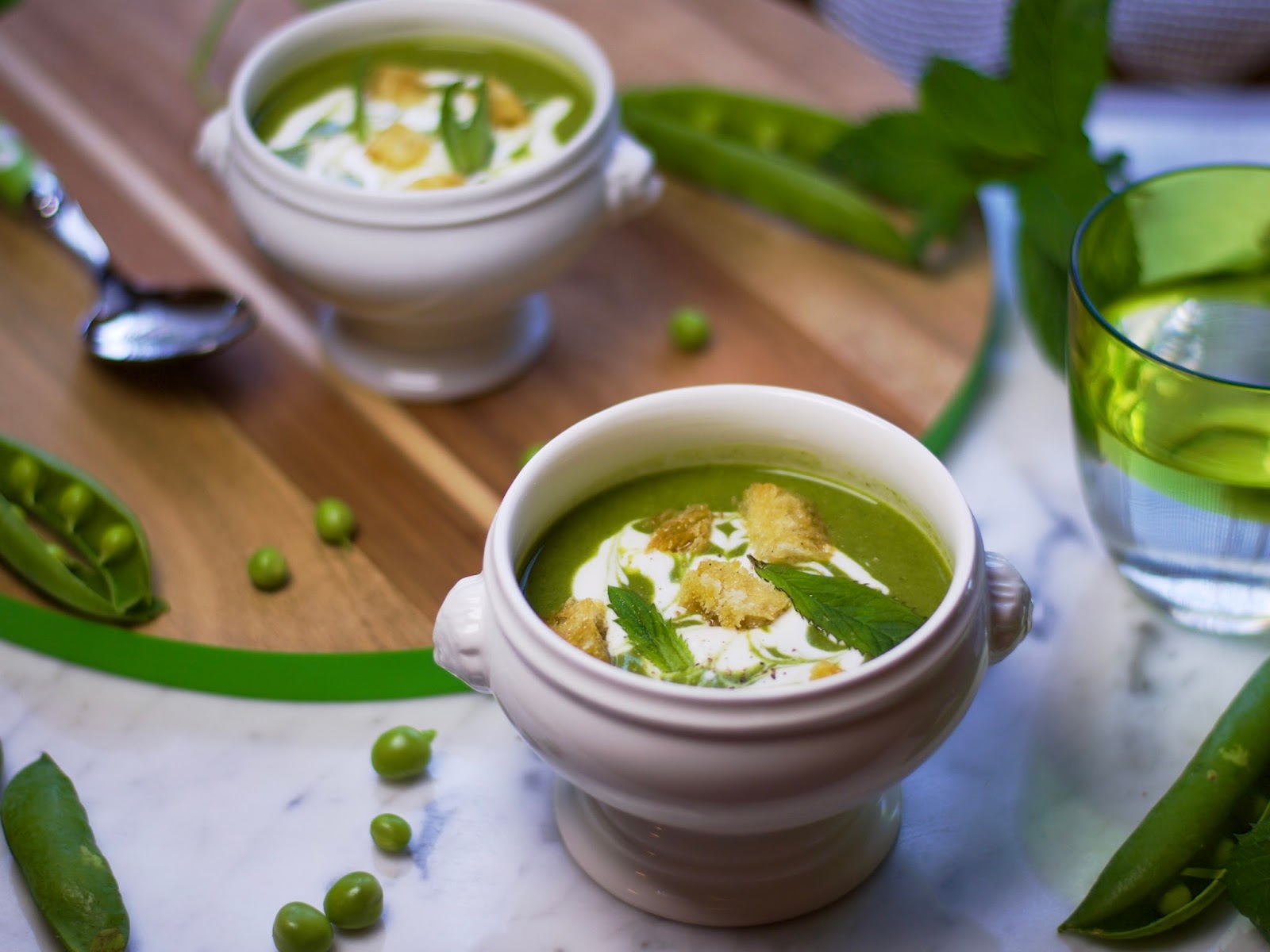 A questo punto non resta che impiattare: usate delle ciotole piccole, meglio se bianche, e versate dentro la zuppa di piselli, aggiungete il mix di caprino e yogurt con un cucchiaino. Aggiungete i cubetti di pane tostato e per concludere aggiungete le foglioline di menta.