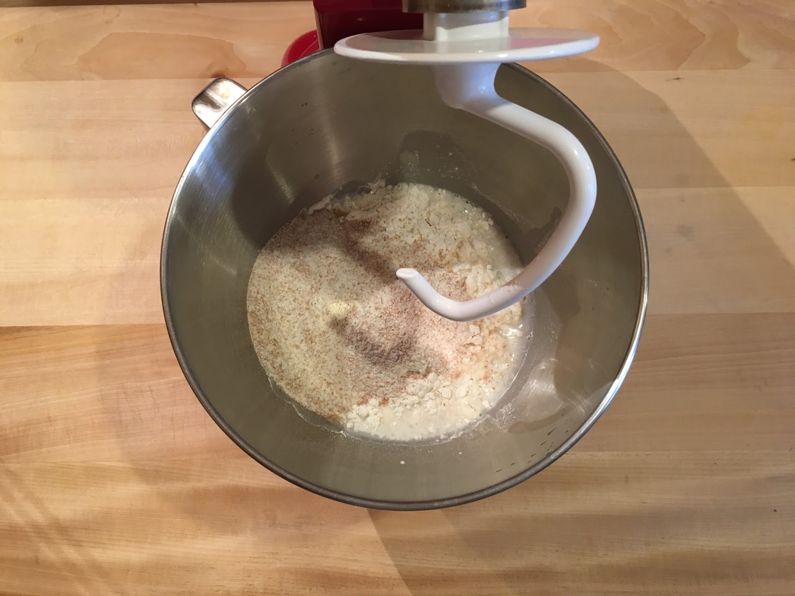 Per prima cosa rinfrescate il vostro lievito madre, io uso il lievito solido, rinfrescatelo come sempre (pari peso di lievito e farina e metà peso di acqua) e lasciatelo maturare per circa 3 ore. A questo punto con la planetaria oppure a mano, sciogliete il lievito con un cucchiaino di miele di acacia e l’acqua tiepida. A questo punto miscelate le due farine e versatele un po’ alla volta finchè non avrete incorporato tutta la dose.