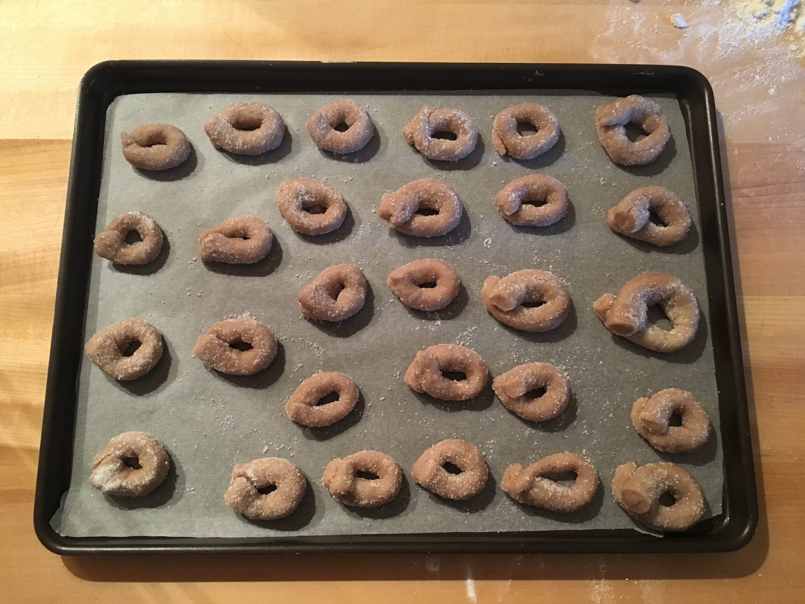 Quando l’impasto sarà freddo dividetelo a pezzi e stendete con le mani dei piccoli filoncini del diametro di 1/2 cm. Tagliate poi l’impasto a pezzetti di circa 7/8 cm poi sovrapponete le estremità e formate delle ciambelline, in modo molto rustico. Cospargete la superficie con dello zucchero e poi trasferite le ciambelline su di una placca da biscotti ricoperta di carta forno.
