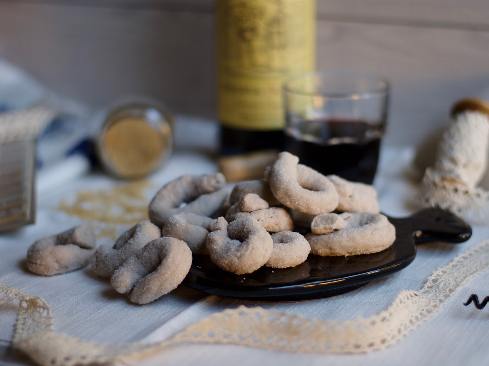 Per il contest io ho deciso di proporre delle ciambelline al vino rosso. Le ho mangiate mille volte ma non le avevo mai fatte, poi qualche settimana fa mi è capitato di mangiarle di nuovo e me ne sono (di nuovo innamorato). Così ho fatto la corte alla cuoca finche non mi ha passato la sua ricetta, una di quelle ricette con misure empiriche… ho convertito tutto, ho fatto qualche modifica ed eccoci qua!