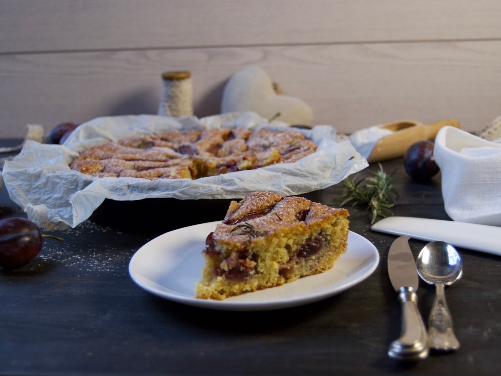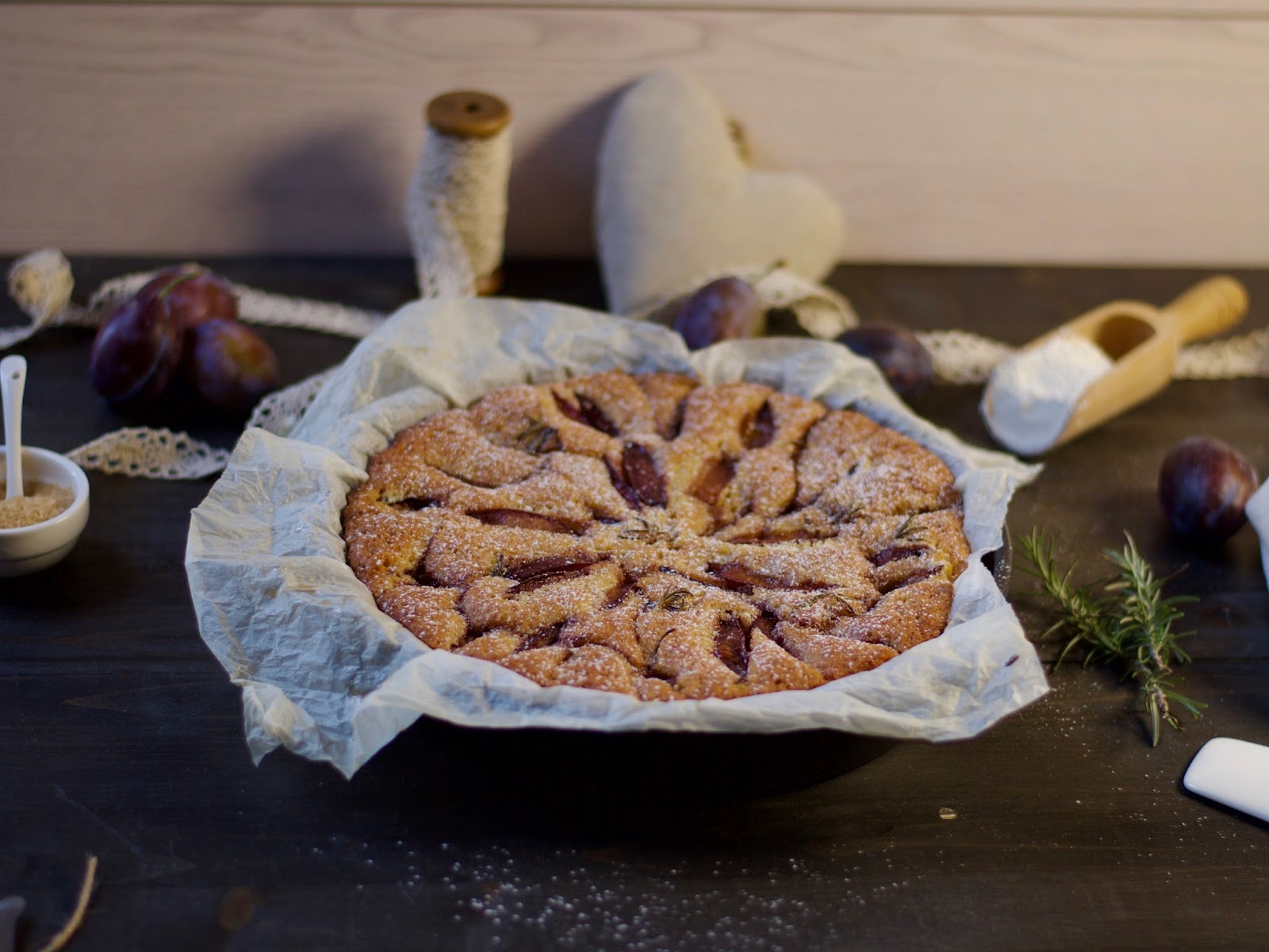Imburriamo o rivestiamo di carta da forno umida una tortiera da 20 cm di diametro e rovesciamo all’interno l’impasto della torta. A questo punto guarniamo la superficie della torta con le susine che abbiamo precedentemente spadellato, aggiungiamo infine il liquido che non è stato assorbito dalle susine in cottura e qualche rametto di rosmarino.