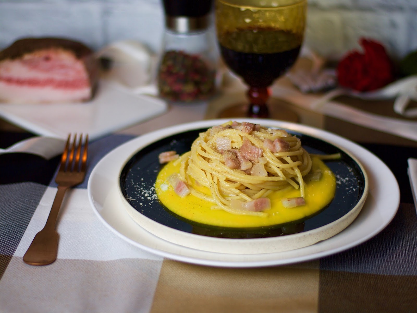 Premetto subito che io vado matto per la carbonara e non tollero le varie ricette di carbonare “a modo mio”. C’è un modo solo di fare la carbonara, quindi lasciamo perdere tutte le schifezze con panna, zafferano etc etc.. Io infatti lo dichiaro subito questa non è una carbonara anche se sembra una carbonara. Non è infatti una carbonara perchè mancano le uova, cioè uno degli ingredienti fondamentali per prepararla. Ho sostituito le uova, utilizzando una crema di patate aromatizzata, in questo, almeno a livello cromatico, la somiglianza con la carbonara originale è piuttosto evidente.