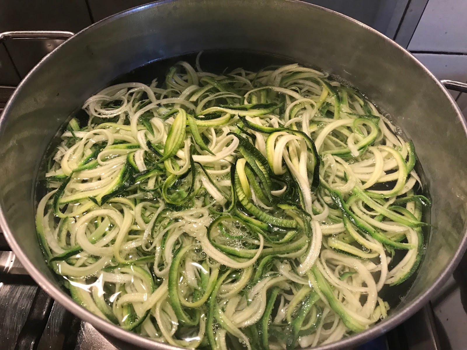 Quando l’acqua bolle, salate e buttate gli spaghetti di zucchina. Non si deve trattare di una vera e propria cottura, basterà giusto sbollentarli. Quindi un paio di minuti sono più che sufficienti.