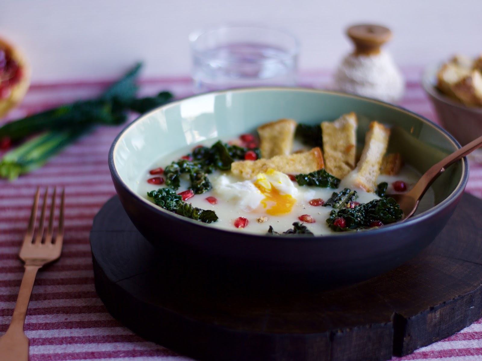 Adesso che tutti gli ingredienti sono pronti, è il momento di impiattare: versate la vellutata in una ciotola, aggiungete qualche foglia di cavolo nero, il pane tostato e qualche chicco di melagrana. Se poi volete “esagerare” e personalizzare la ricetta, io vi consiglio di aggiungere un uovo pochè. In questo modo aggiungerete un po’ di proteine alla vellutata e avrete una super ricetta per pranzo.